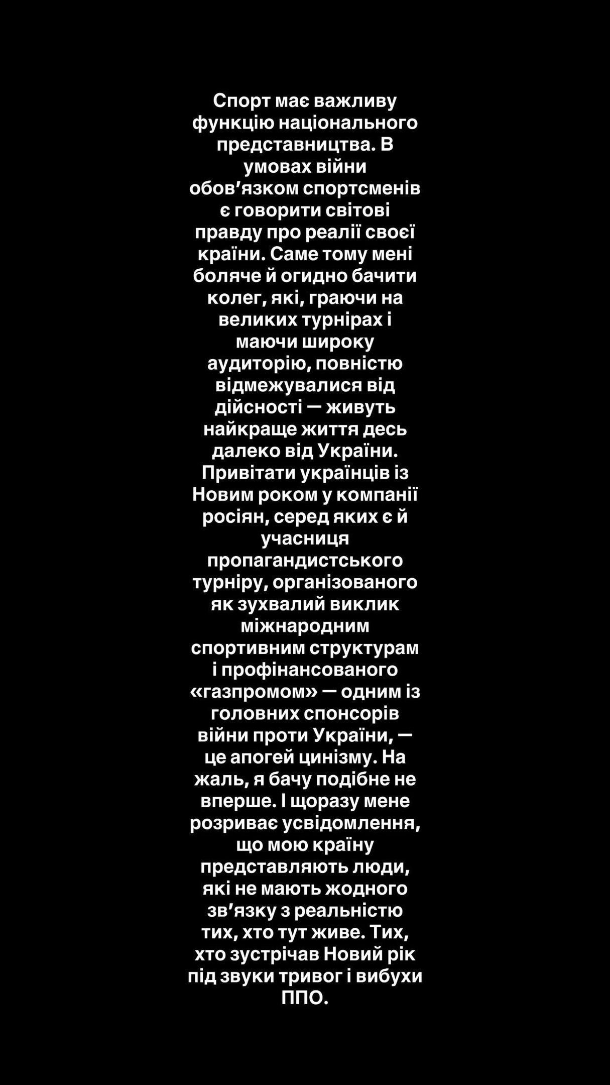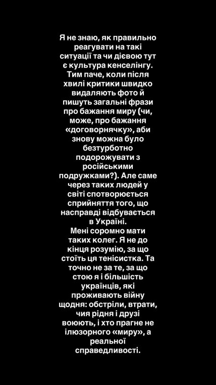 Именно из-за таких людей в мире искажается восприятие того, что на самом деле происходит в Украине. Мне стыдно иметь таких коллег. Я не до конца понимаю, за что стоит эта теннисистка. Но точно не за то, за что стою я и большинство украинцев, которые проживают войну каждый день: обстрелы, потери, чьи родные и друзья воюют, и кто стремится не к иллюзорному "миру", а к реальной справедливости.