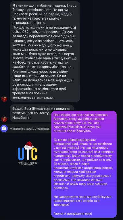 Я признаю, что я публичный человек. И несу большую ответственность. То, что вы написали "россияне": во-первых, ни одна из игроков не играет за страну-агрессора. И это факт.