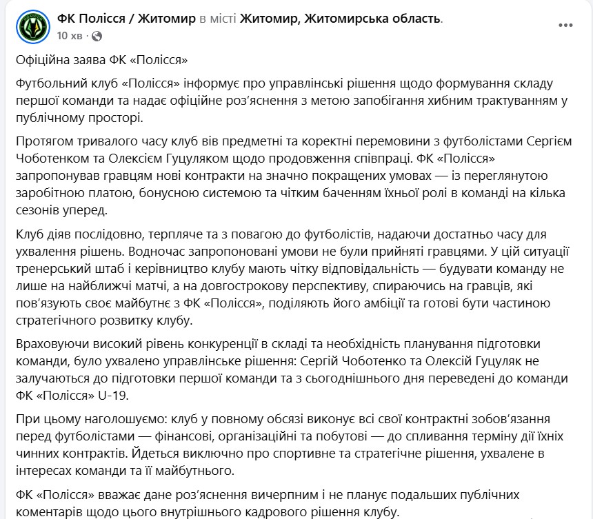 Учитывая высокий уровень конкуренции в составе и необходимость планирования подготовки команды, было принято управленческое решение: Сергей Чоботенко и Алексей Гуцуляк не привлекаются к подготовке первой команды и с сегодняшнего дня переведены в команду ФК "Полесье" U-19.
