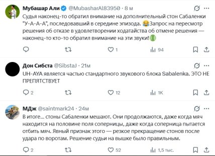 При счете 2:1 на подаче Свитолиной Соболенко после своего удара традиционно громко выкрикнула. Мяч попал в корт, но судья на вышке остановила розыгрыш и отдала очко Элине, назвав звук, который издала Арина, "помехой". "Нейтралка" пыталась оспорить это решение, но рефери после просмотра видеоповтора заявила, что "это был необычный звук".