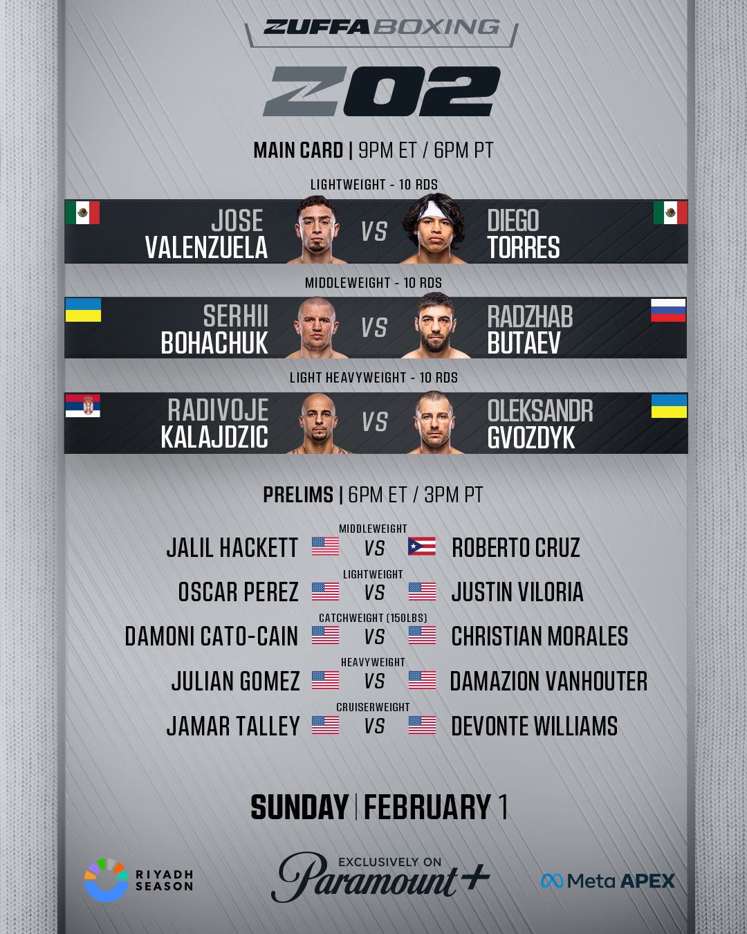• Сергей Богачук (26–3, 24 KO) – Раджаб Бутаев (16–1, 12 KO)