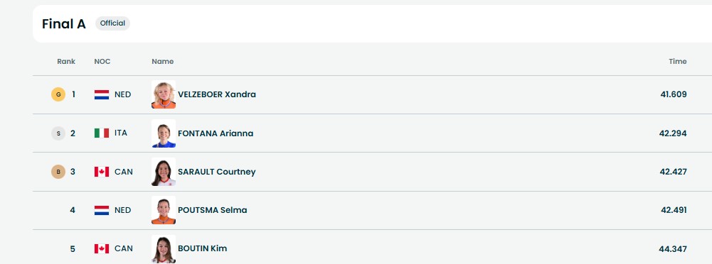 - Ксандра Велзебур (Нидерланды), 2. Арианна Фонтана (Италия), 3. Кортни Саро (Канада).