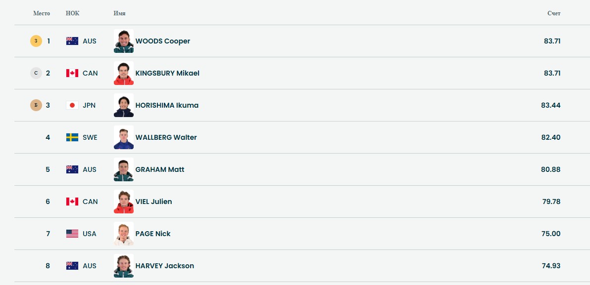 - Купер Вудс-Топалович (Австралия), 2. Микаэль Кингсбери (Канада), 3. Икума Хорисима (Япония).