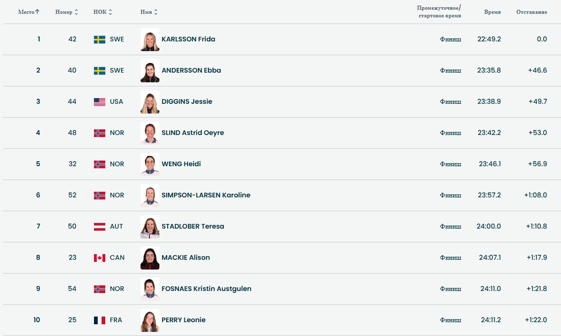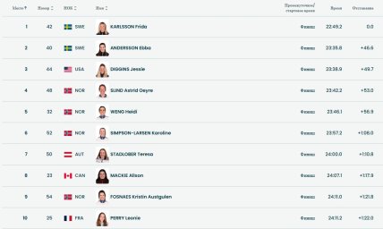 - Фрида Карлссон (Швеция), 2. Эбба Андерссон (Швеция), 3. Джессика Диггинс (США).