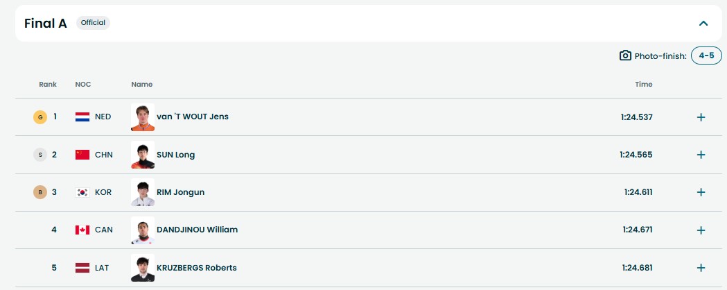 - Йенс ван Ваут (Нидерланды), 2. Сунь Лун (Китай), 3. Рим Чжон Ун (Южная Корея) — 1.24,611.