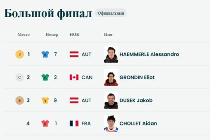 - Алессандро Хеммерле (Австрия), 2. Элиот Гронден (Канада), 3. Якоб Дузек (Австрия).