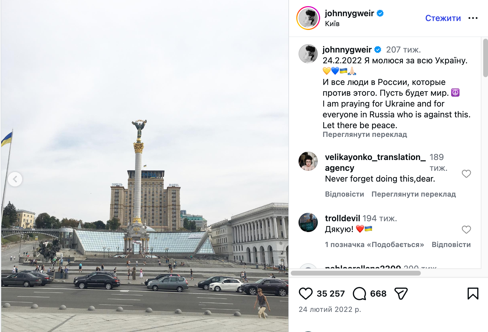 На Олимпиаде‑2026, которая проходит в Италии, Джонни Вейр появился в вышиванке, снова подчеркнув свою поддержку Украине. Он опубликовал видео под песню Артема Пивоварова "Ой на горі":