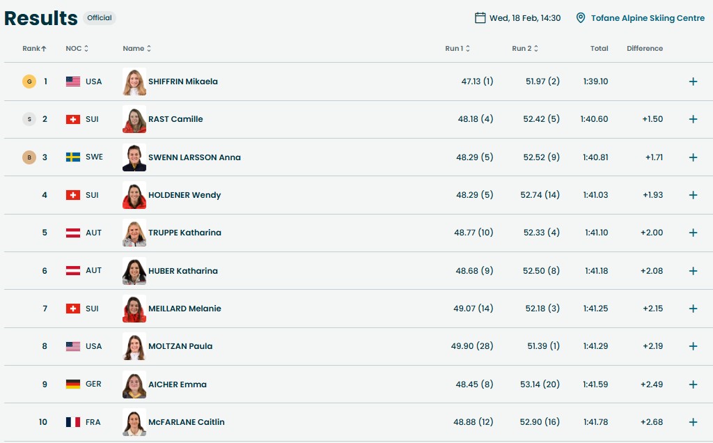 - Микаэла Шиффрин (США), 2. Камилла Раст (Швейцария), 3. Анна Свенн-Ларссон (Швеция).
