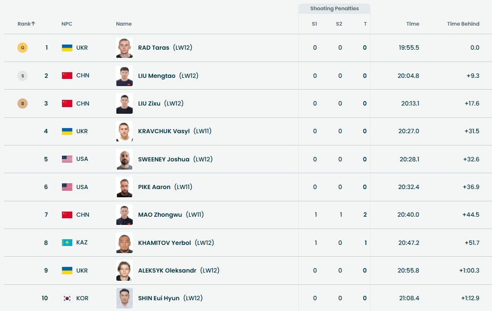 11:35 — 🥇Парабиатлон. Спринт, мужчины (с поражениями опорно-двигательного аппарата, класс сидя). Тарас Радь выиграл "золото", Василий Кравчук занял 4-е место, Григорий Шимко — 15-е, Павел Баль — 12-е, а Александр Алексик — 9-е.