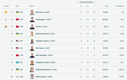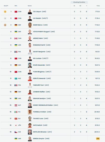 13:40 — 🥇Парабиатлон. Спринт, мужчины (с поражениями опорно-двигательного аппарата, класс стоя). Григорий Волчинский занял 4-е место, Серафим Драгун — 14-е, Сергей Романюк — 6-е, а Дмитрий Среда не стартовал.