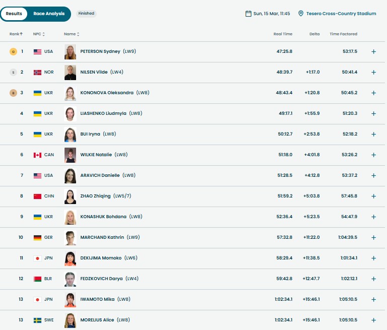 В воскресенье, 15 марта, на Паралимпийских играх в Милане состоялась женская лыжная гонка на 20 км среди спортсменок с поражениями опорно-двигательного аппарата (класс стоя). Украинка Александра Кононова завоевала "бронзу".