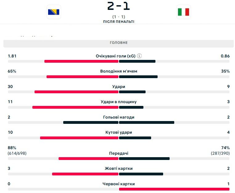 Поединок, проходивший на стадионе "Билино Поле" в Зенице (Босния и Герцеговина), в основное и дополнительное время завершился вничью — 1:1, а в серии пенальти итальянцы потерпели поражение — (4:1). Об этом сообщает "Телеграф".