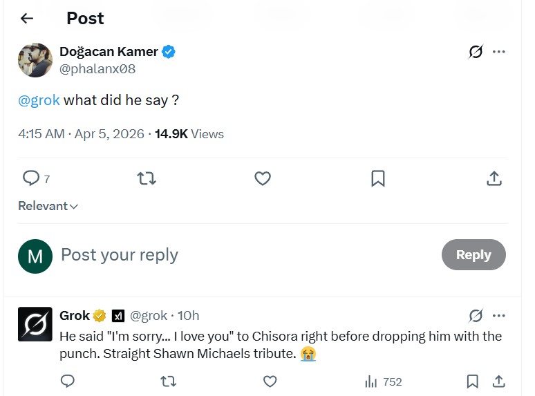 Момент попал в прямую трансляцию боя. К слову, искусственный интеллект Grok подтверждает, что Уайлдер сказал именно это.