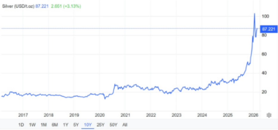 Срібло за той же період повторило динаміку з 29,7 долара до 82,7 долара за унцію, а цього року піднімалося вище 100 доларів.
