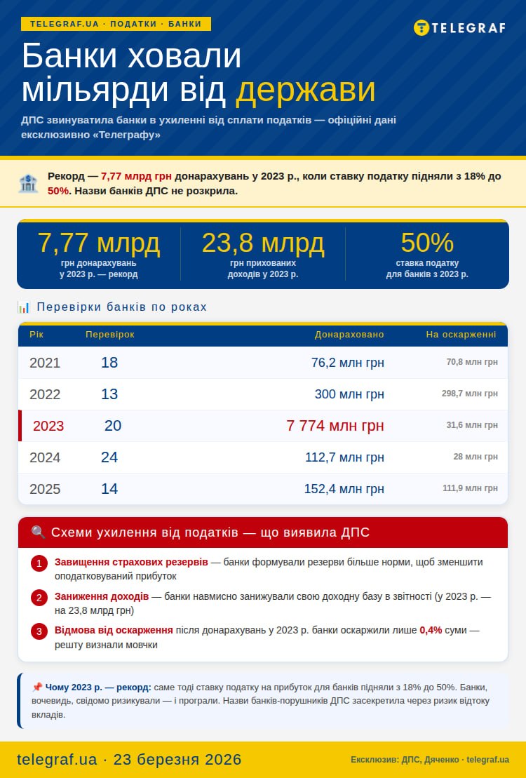 Найбільше порушень під час податкових перевірок було зафіксовано у 2023 році, коли ставка податку на прибуток для банківських установ вперше була піднята із довоєнного рівня 18% до 50%.