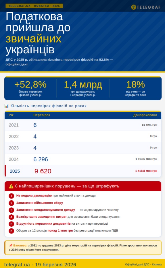 Нагадаємо, що раніше Володимир Кизима у коментарі "Телеграфу" розповідав, що державна податкова служба у 2025 році наполовину (на 52,8%) збільшила кількість перевірок простих українців (не підприємців), тобто фізосіб — з 6,3 тис. до 9,6 тис.