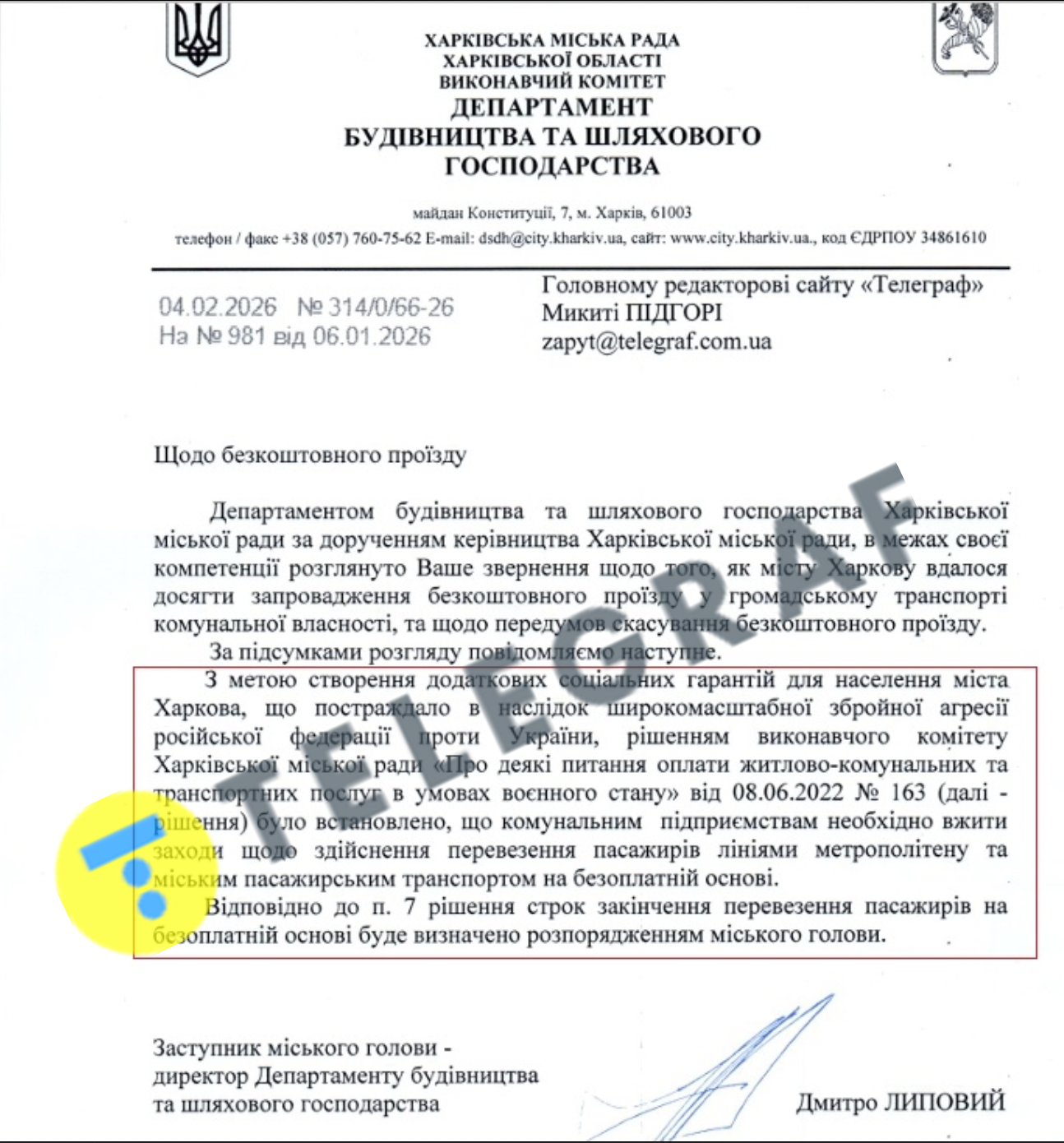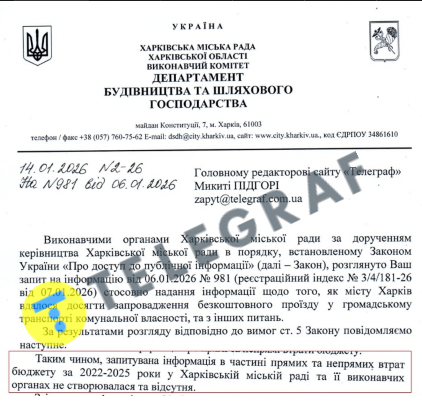 Відповідь Харківської міської ради на запит "Телеграфа"