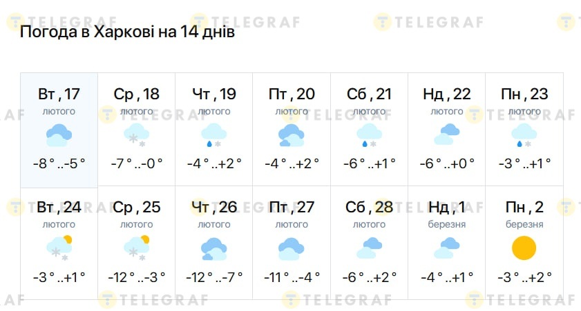 Якою буде погода у Харкові протягом 17 лютого-2 березня 2026