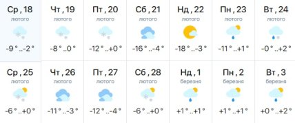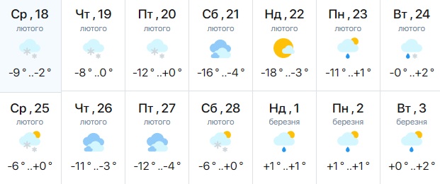Так, у першій декаді лютого у більшій частині областей, крім південних, знову очікуються морози до -20 °C. З 8-10 лютого морози почнуть поступово слабшати, хоча на північному заході холодна погода, мабуть, протримається майже до кінця місяця.