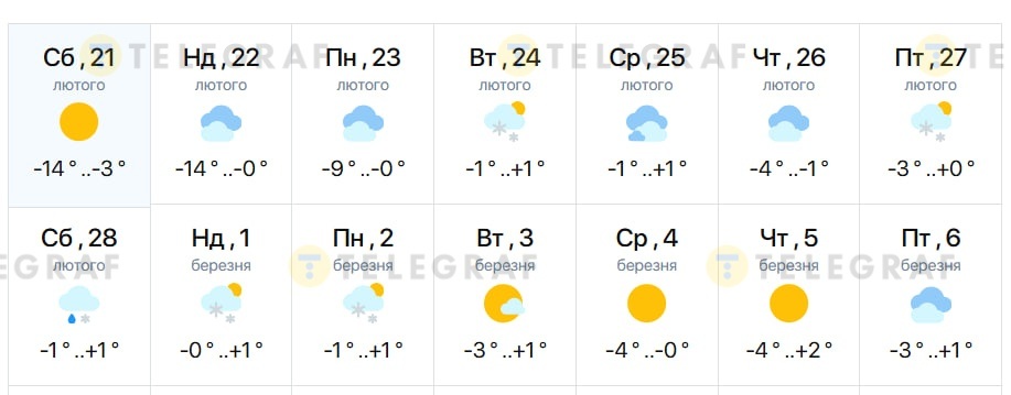 Найближчими днями температура залишатиметься низькою. 21-22 лютого вночі очікується до -14 С°, а вдень повітря прогріватиметься лише до -3…0 С°. Початок наступного тижня також буде прохолодним — 23 лютого прогнозують до -9 С° вночі.