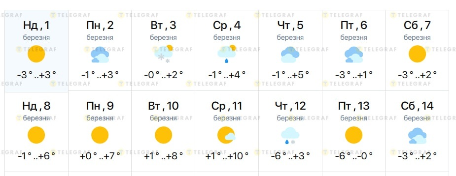 Втім, 12-14 березня можливе короткочасне похолодання до -6 градусів вночі та близько 0…+3 градусів вдень. У четвер прогнозують мокрий сніг.
