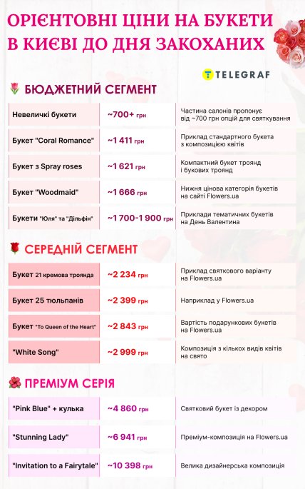 Чим більший букет — тим дешевше: які ціни на квіти до 14 лютого та як не переплатити (інфографіка)