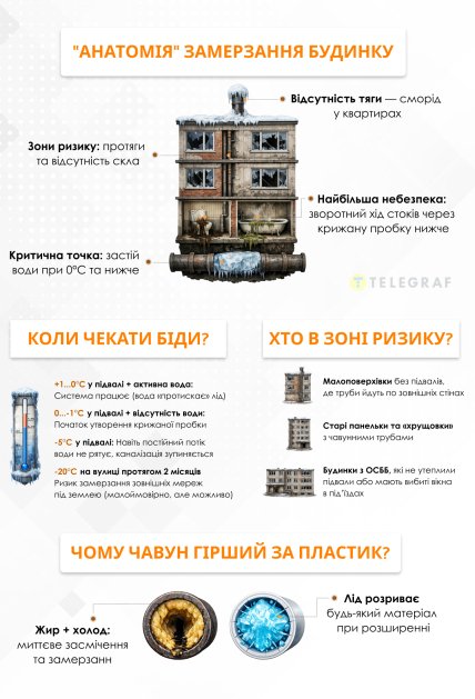 "Телеграф" розповідає, за яких умов може замерзнути каналізація в багатоповерхівках без тепла, які труби під найбільшою загрозою та що може статися з мешканцями перших поверхів.