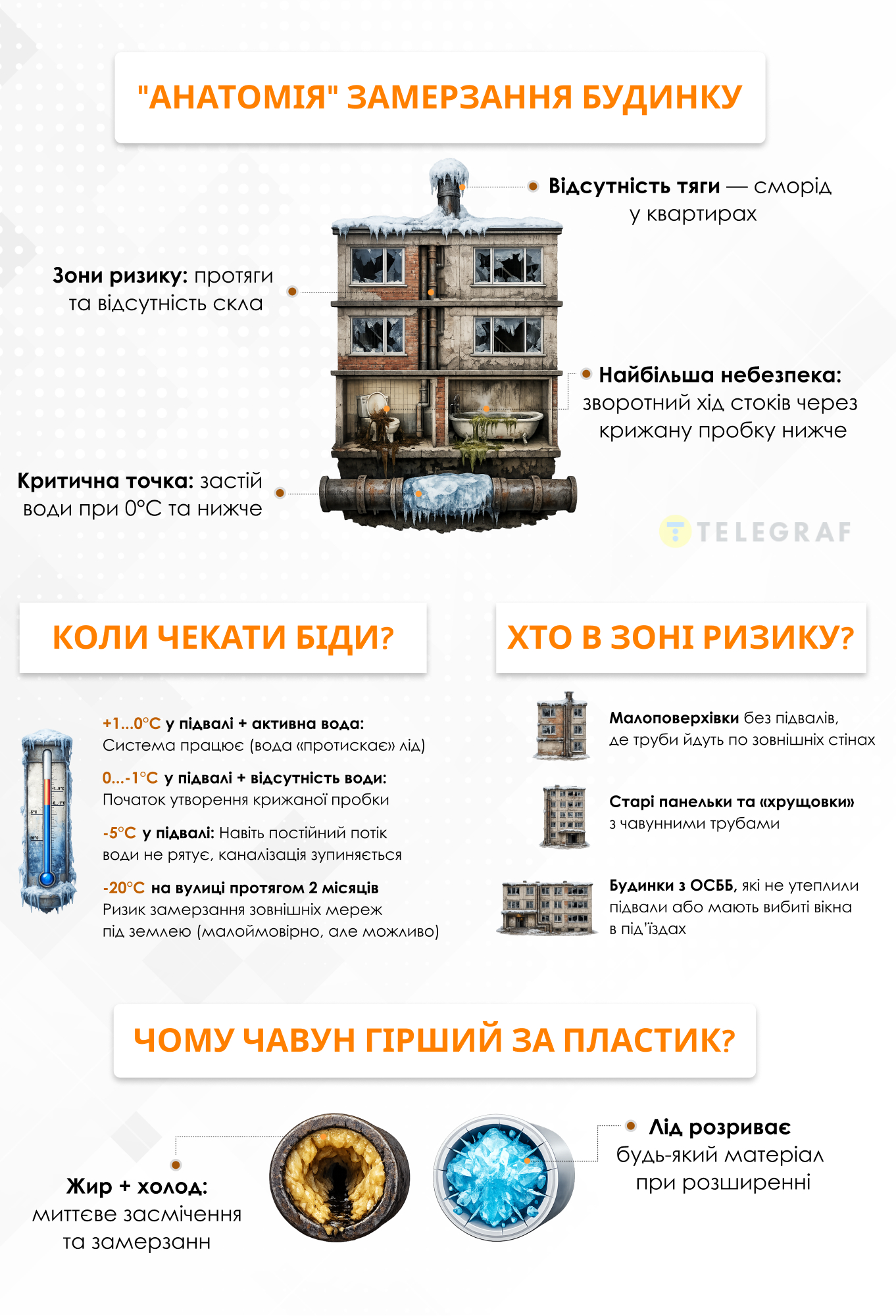 Якщо ваш будинок потрапляє до переліченого вище: старий, з перебоями в опаленні, з трубами по зовнішніх стінах — варто бути напоготові. Що саме робити і куди дзвонити, якщо щось пішло не так — читайте в наступному матеріалі "Телеграфу".