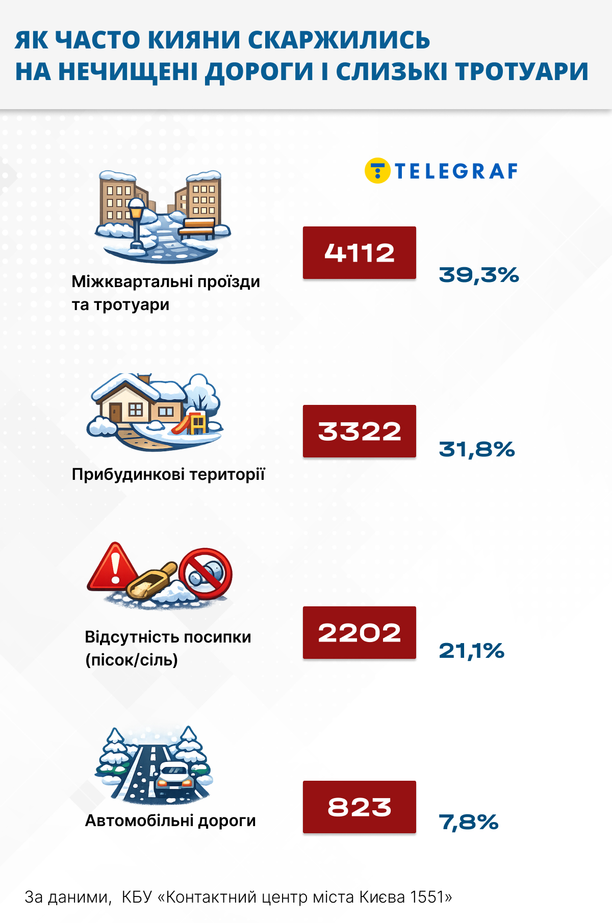Тим часом кияни намагалися достучатися до влади і КП, повідомляючи про претензії до стану доріг та тротуарів. За три зимові місяці до "Контактного центру міста Києва 1551" надійшло 10 459 звернень (тобто більше сотні на день), ще 16 скарг зафіксували в управління документообігу КМДА та 98 – в комунальному об’єднанні "Зеленбуд".
