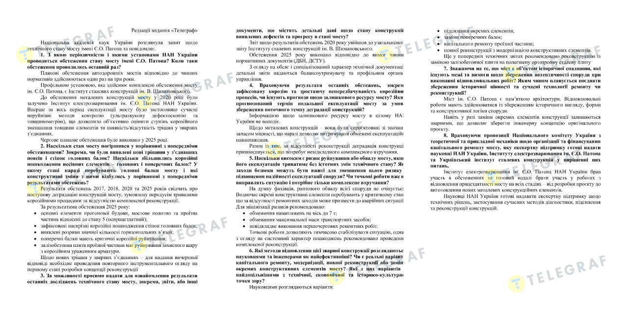 Наскільки стан мосту погіршився з того часу? У відповіді на запит "Телеграфу" в НАН пояснюють: "результати обстежень свідчать про поступову деградацію конструкцій мосту". Причина – "в тривалих корозійних процесах та відсутності комплексної реконструкції".