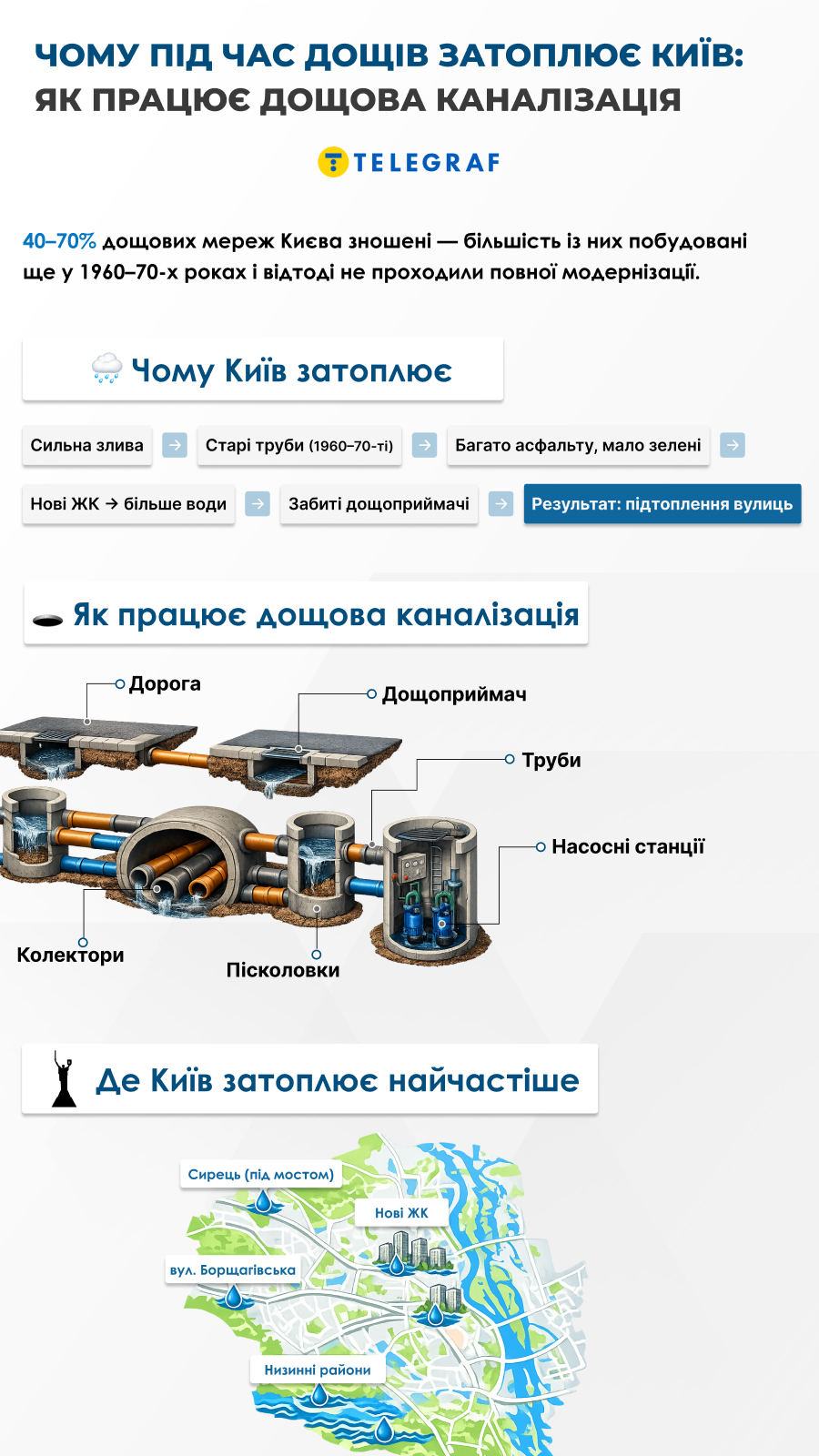 Щойно синоптики оголошують сильний дощ, тисячі киян вже знають, що буде далі. Сирець піде під воду під мостом, Борщагівська вулиця перетвориться на річку, а паркінги поблизу нових житлових комплексів наберуть воду ще до того, як скінчиться злива. "Телеграф" з'ясував, чому дощова каналізація міста вже не справляється з опадами, хто відповідає за цей хаос і чи є хоч якийсь шанс виправити ситуацію до наступного сезону злив.