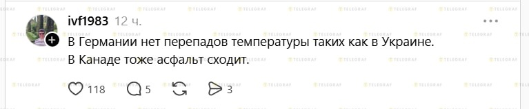 Користувачі також згадали кліматичні фактори: у Німеччині немає різких перепадів температури, на відміну від України, і через це дороги довше зберігаються цілими. За словами українця, у Канаді асфальт також швидко руйнується через морози.
