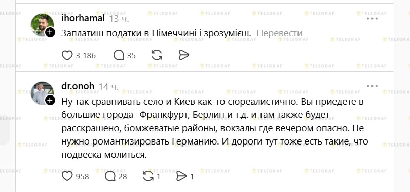 Частина користувачів зазначила, що у Німеччині високі податки, які частково витрачають на дороги. Інші зауважили, що порівнювати столицю з маленьким селом нерозумно, адже великі європейські міста теж мають проблеми з дорогами та небезпечні райони.