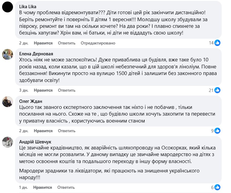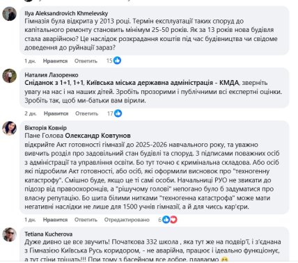 Крім того, батьки не можуть зрозуміти причини бездіяльності адміністрації у 2023-2025 роках, коли РДА мала інформацію про погіршення стану будівлі гімназії, але не укріпіли конструкції. А також висловлюють нерозуміння, як, маючи висновок НДІ, чиновники погодили прийом дітей до школи у вересні минулого року. Ще один дивний момент — наприкінці 25 лютого гімназію виключили з переліку шкіл, що здійснювали набір до п'ятих класів.