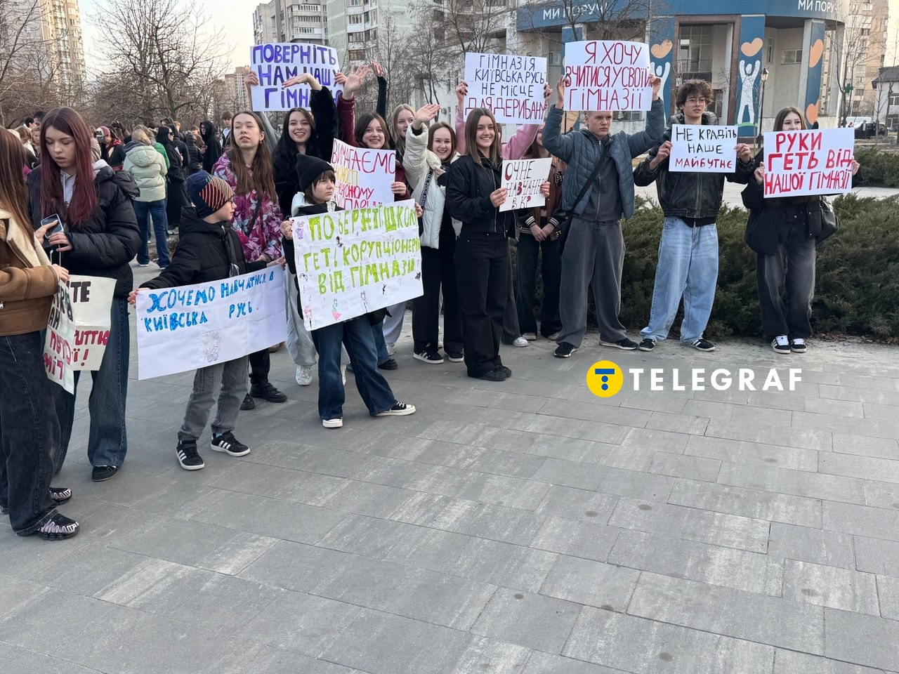 Пропозицію в батьківсько-учнівській спільноті сприйняли без ентузіазму. Дорослі говорили про те, що ситуація посилює стрес у дітей, в якому вони живуть через війну. А також наголошували, що випускники будуть позбавлені можливості довчитися в стінах гімназії. Діти своє ставлення висловили на плакатах, з якими ввечері понеділка, 23 березня, прийшли під стіни Дарницької РДА, де тривала зустріч з громадою. Основні меседжі: "Хочемо навчатися у "Київській Русі", "Очне навчання в КР", "Вимагаємо законності, ні – беззаконню" і заклики не закривати і врятувати школу.