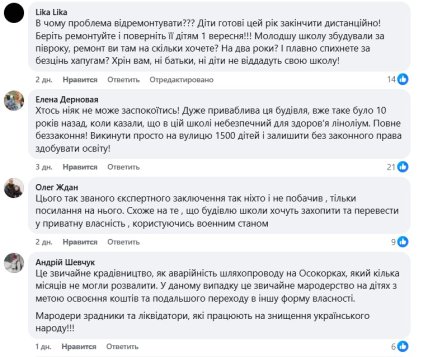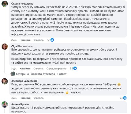 А з початком весняних канікул виявилось – технічний стан будівлі становить потенційну небезпеку. Про це батьки дізнались із допису на сторінці голови Дарницької РДА Олександра Ковтунова. В ньому зазначено, що під час комплексного обстеження в будівлі зафіксували: