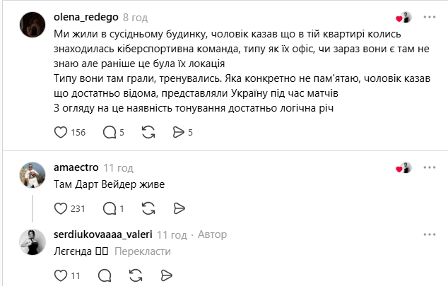 "Ми жили в сусідньому будинку, чоловік казав що в тій квартирі колись знаходилась кіберспортивна команда, типу як їх офіс, чи зараз вони є там не знаю, але раніше це була їх локація. Типу вони там грали, тренувались. Яка конкретно не пам'ятаю, чоловік казав що достатньо відома, представляли Україну під час матчів. З огляду на це наявність тонування достатньо логічна річ";