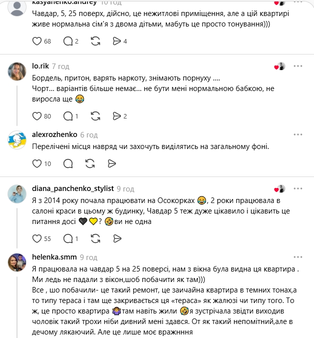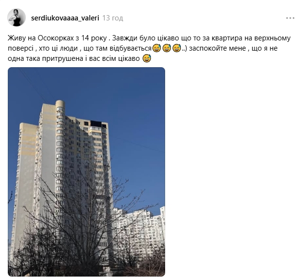 "Живу на Осокорках з 14 року. Завжди було цікаво, що то за квартира на верхньому поверсі, хто ці люди, що там відбувається..) заспокойте мене, що я не одна така притрушена і вас всім цікаво", — написала вона.