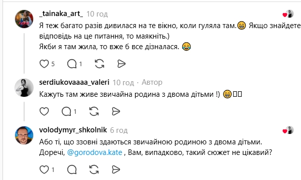 "Я теж багато разів дивилася на те вікно, коли гуляла там. Якщо знайдете відповідь на це питання, то маякніть.) Якби я там жила, то вже б все дізналася";