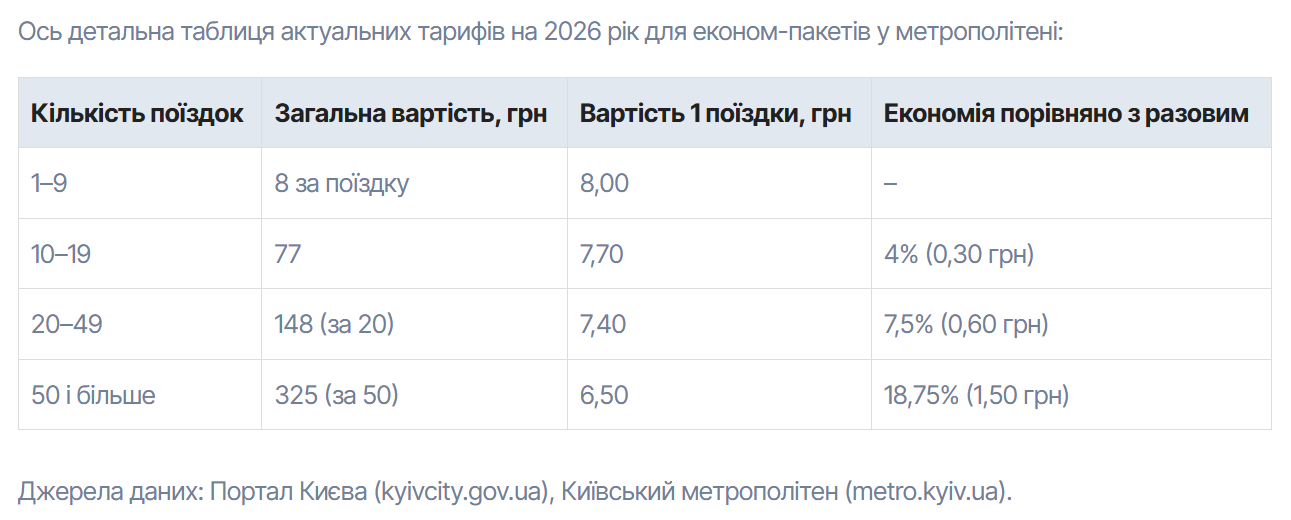 За даними Fair.org, собівартість метро за розрахунками на 2026 рік сягає 44,68 гривень. Базовий тариф за одну поїздку тримається на рівні 8 гривень, роблячи підземку доступною для студентів, офісних працівників та туристів. Ця стабільність радує киян, адже, незважаючи на зростання собівартості до 44 гривень на пасажира, влада утримує ціну, компенсуючи різницю з бюджету.