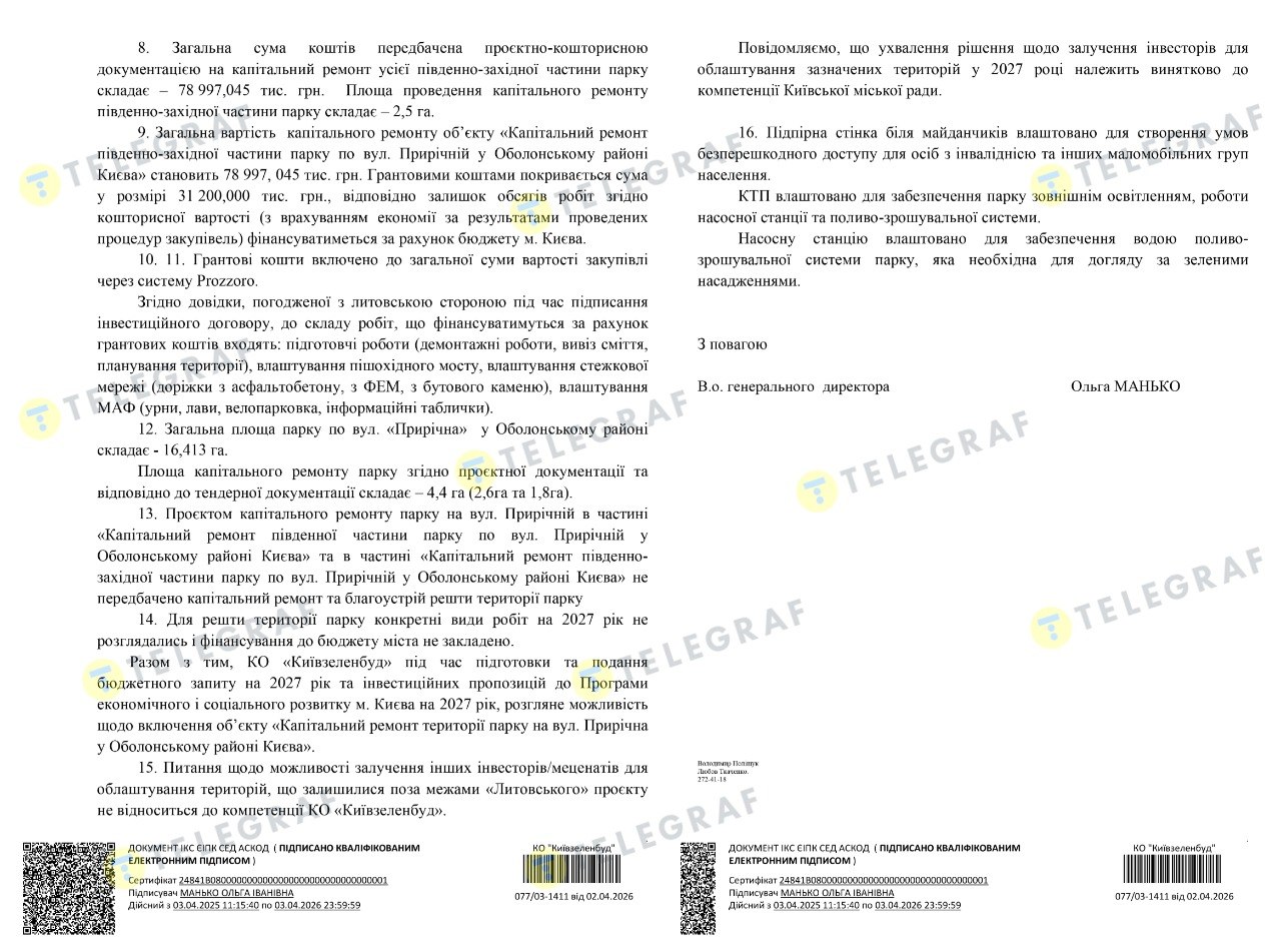 Якщо з першою частиною робіт панує фінансова плутанина, то з другим етапом – оновлення 2,5 га південно-західної частини парку – ситуація на папері виглядає чіткіше. У березні 2026 року "Київзеленбуд" уклав договір №16/3 з ТОВ "Євротехнологія Груп".