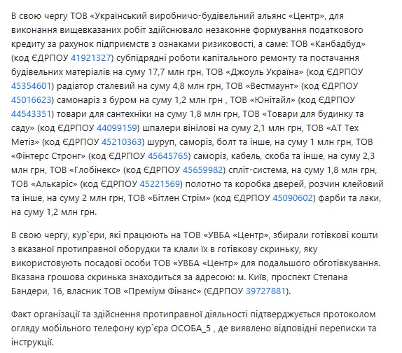 У останньому випадку тендером зацікавились правоохоронці. За попередніми даними, як випливає з судової ухвали, представники "УВБА "Центр" нібито незаконно сформували податковий кредит через субпідрядників та постачальників матеріалів. Наразі досудове розслідування ще триває.