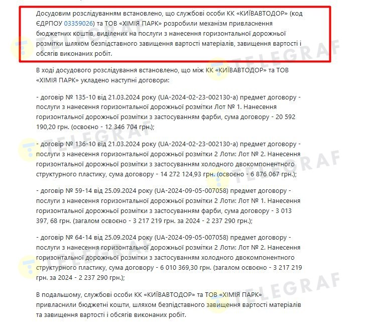 Попри репутаційні скандали на Рівненщині, ТОВ "Хімія Парк" успішно працювало в останні роки в столиці. Лише у 2024 році фірма підписала з "Київавтодором" контракти на загальну суму 43,9 млн грн. Ці та інші документи зараз вивчають правоохоронці в межах кримінального провадження №12024100060002838. За версією слідства, співробітники комунальної корпорації та приватної фірми можуть бути причетні до завищення вартості та обсягів робіт при нанесенні дорожньої розмітки.