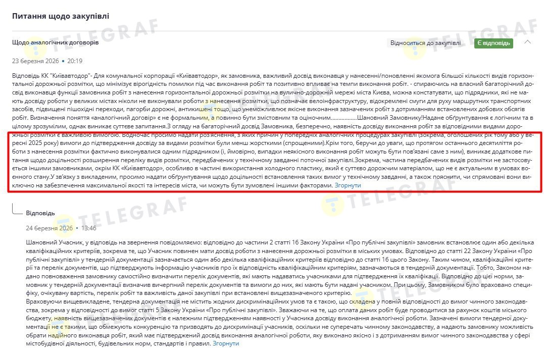 На додачу учасник не підтвердив досвід нанесення специфічних видів розмітки. Таких, які використовують для позначення велодоріжок, смуг для руху громадського транспорту, автокишень, підвищених пішохідних переходів тощо. При цьому ТОВ "Укркварц" у своїх запитаннях до "Київавтодору" на сторінці Prozorro назвав таку вимога ексклюзивом комунальної корпорації. А також зазначив, що вона створює підґрунтя для дискримінації учасників.