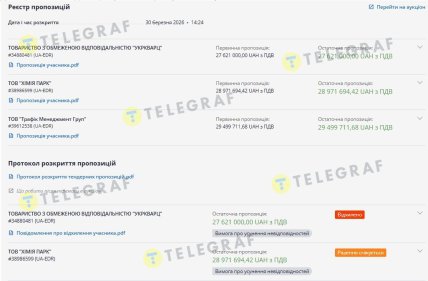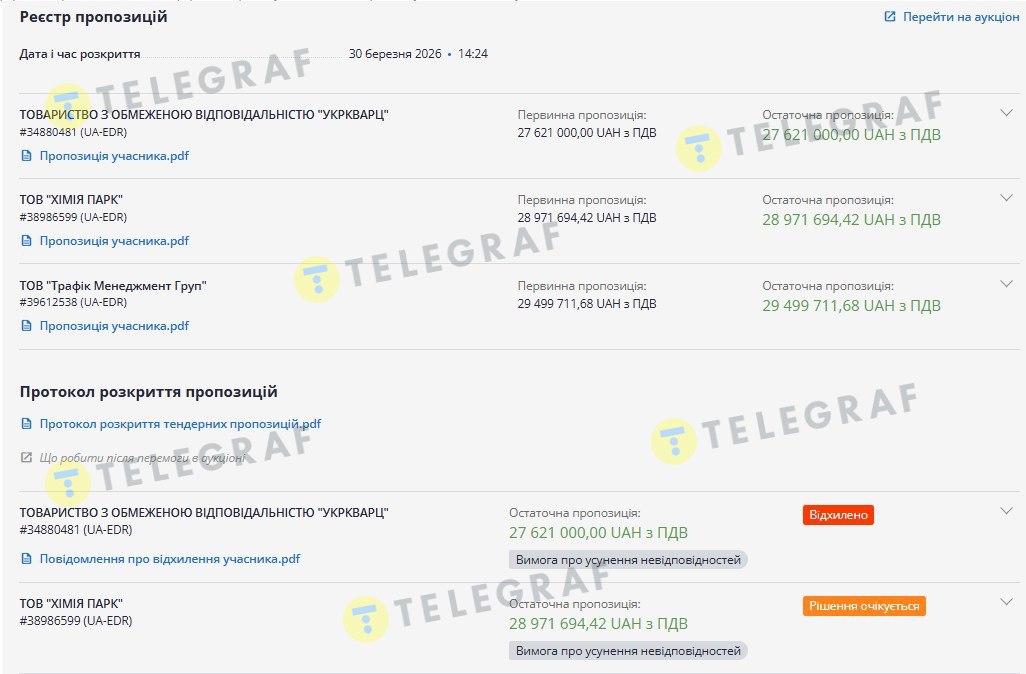 Саме навколо лоту №1 (фарба) розгорнулася суперечка. На торги прийшли три учасники – ТОВ "Хімія Парк", "Трафік Менеджмент Груп" та "Укркварц". Останній запропонував найвигіднішу ціну – 27,6 млн грн, що майже на два мільйони гривень менше за очікувану вартість.