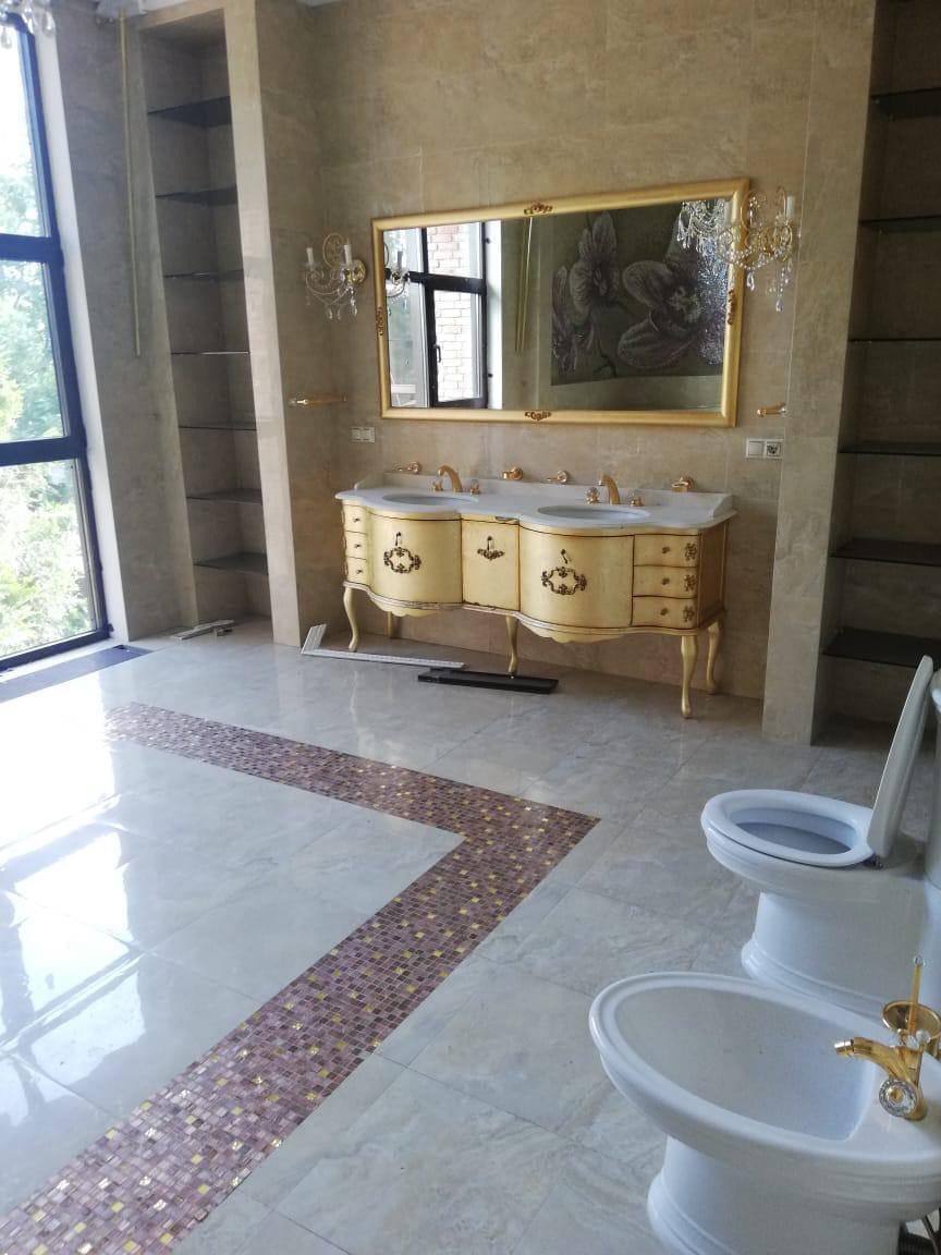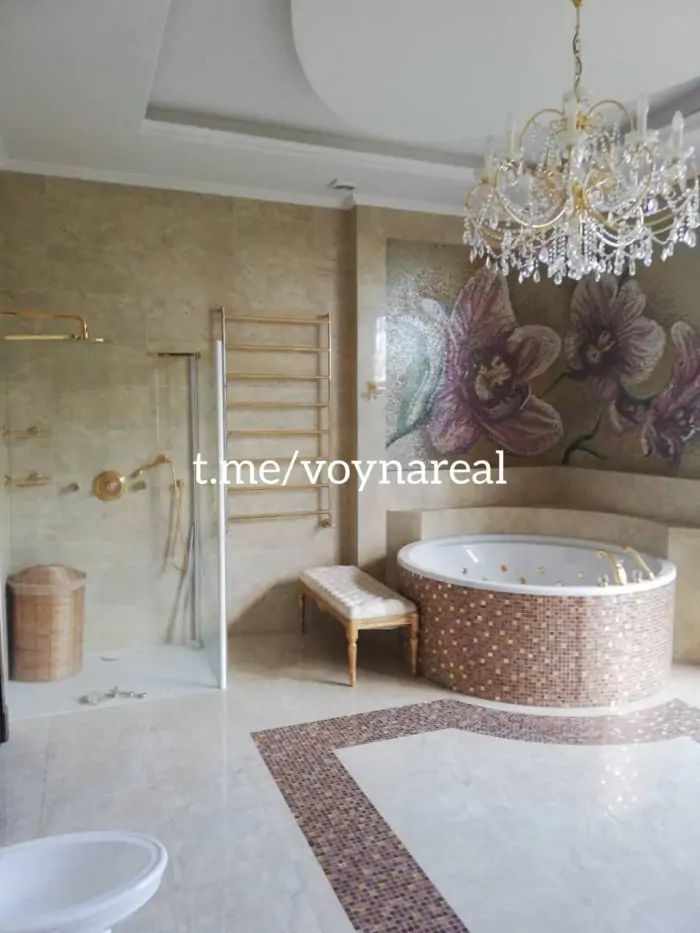 У ванній кімнаті Симоненко розмістив ще одну кришталеву люстру — меншого розміру. Стіни прикрашені квітковою мозаїкою та великим дзеркалом у позолоченій рамі. Крани у ванній, душі та умивальнику, а також сушки для рушників виконані з позолотою. Навпроти унітазу встановлено панорамне вікно.