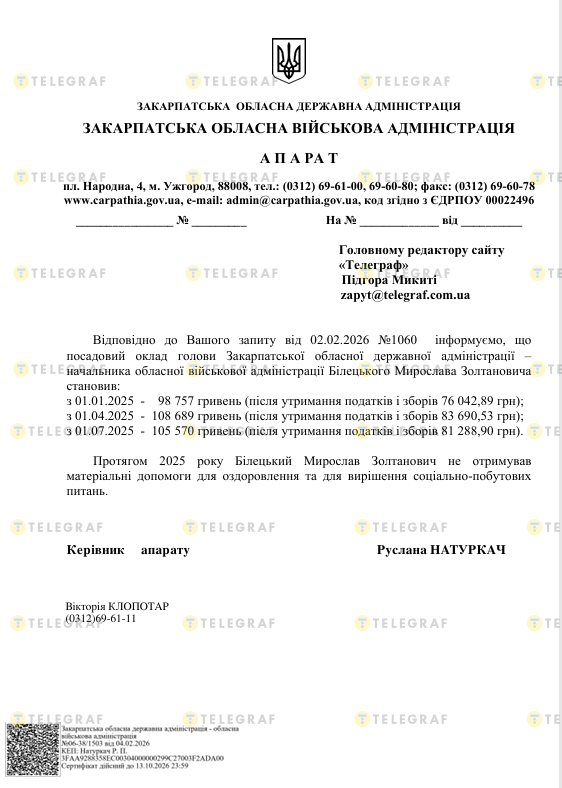 Про це свідчить офіційна відповідь Закарпатської ОВА на запит "Телеграфа". Згідно з документом, посадовий оклад Мирослава Білецького після утримання податків і зборів становив:
