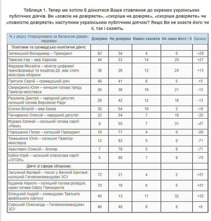 За даними Київського міжнародного інституту соціології (опитування 9-14 січня 2026 року), найкраще респонденти відносяться до Залужного (72% довіряють, 21% не довіряють, а баланс становить +51%) та до Кирила Буданова (70% довіряють, 19% не довіряють, а баланс становить +51%). При цьому головнокомандувачу ЗСУ Олександру Сирському довіряють 46%, не довіряють – 40%, баланс становить +6%. Усика в цьому списку немає.