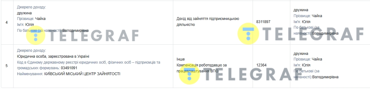 Своєю чергою, дружина народного обранця Юлія Чайка за минулий рік отримала дохід від підприємницької діяльності 8 311 897 гривень. Також вона мала від держави компенсацію за працевлаштування внутрішньо-переміщених осіб (ВПО) у розмірі 12 364 гривень.