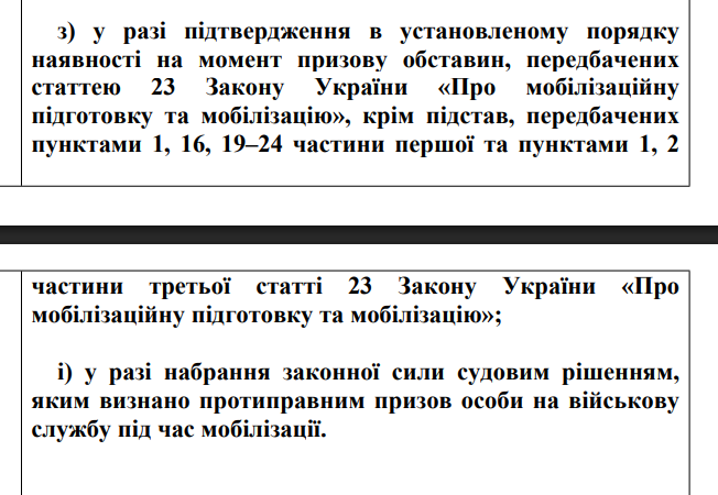 У проєкті йдеться, що закон не стосуватиметься підстав за пунктами 1, 16, 19–24 частини першої та пунктами 1–2 частини третьої статті 23. Зокрема це: